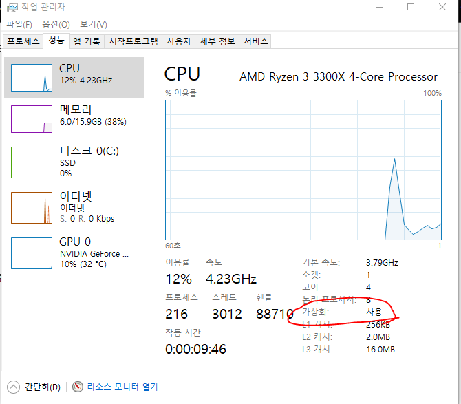 이렇게 작업관리자에 들어가 성능 부분에서 가상화 부분을 보면 된다.