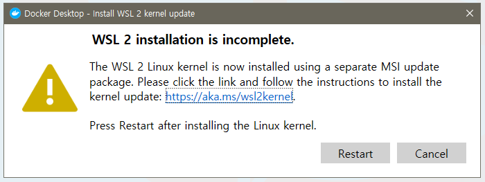 이번에는 WSL2의 설치가 불완전하다고 한다