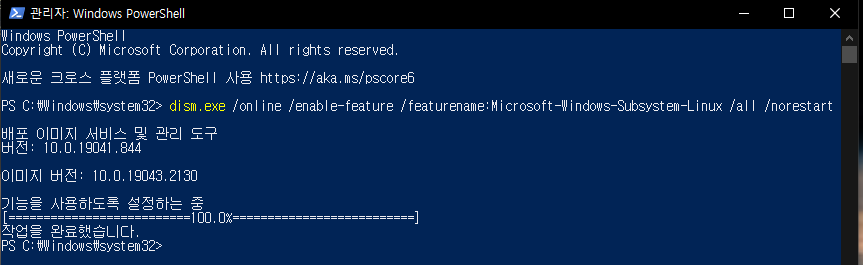 2. 리눅스 서브시스템 활성 명령어 입력