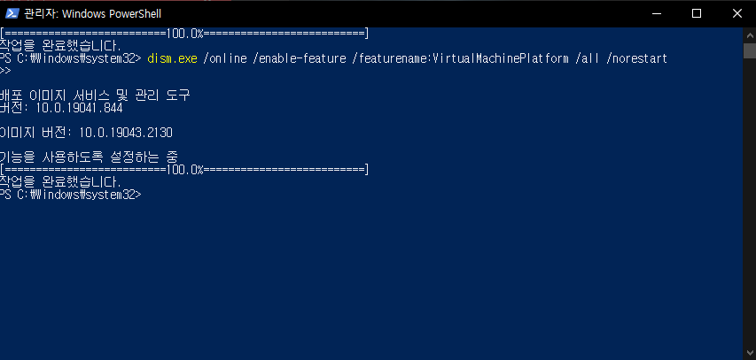 3. 가상 머신 플랫폼 기능 활성화 명령어 입력